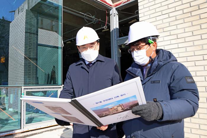 이동진 도봉구청장은 13일 창1동 주민센터 신축 현장을 방문 점검하고, 쌍문1동 공공복합청사 부지를 둘러봤다. 사진은 이 구청장(왼쪽)이 창1동 주민센터 신축 현장을 방문해 현장을 점검하고 있는 모습. (사진제공=도봉구청)