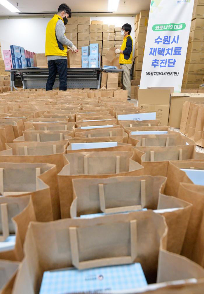 코로나19 오미크론 변이 대유행 속에 신규 확진자가 5만명에 육박하며 재택치료 환자 수도 급증하고 있는 9일 경기 수원시청에서 재택치료추진단 직원들이 재택치료자들에게 지급할 물품을 정리하고 있다.