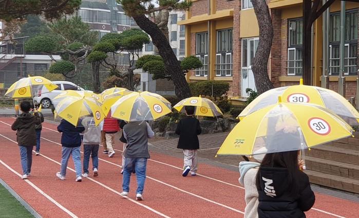 경기도가 비 오는 날 어린이들의 등·하교 안전을 위해 올해도 도내 초등학생 2만5000명에게 '안전우산'을 제공한다고 17일 밝혔다. 사진은 안전우산을 쓰고 걸어가는 어린이들.
