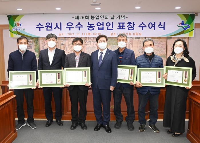 경기 수원시가 제26회 농업인의 날(11월11일)을 기념해 수원시 농업발전을 위해 노력한 농촌지도자수원시연합회 하경훈 사무국장 등 수원 농업인 6명에게 수원시장 표창을 수여했다. 사진은 염태영 시장(가운데)과 표창을 받은 농업인들이 기념촬영을 하고 있는 모습. (사진제공=수원시청)