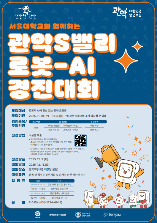 [시민일보 = 문민호 기자] 서울 관악구(구청장 박준희)는 오는 12월13일 관악구청 8층 대강당에서 개최하는 ‘관악S밸리 로봇·인공지능(AI) 경진대회’ 참가자를 모집한다.