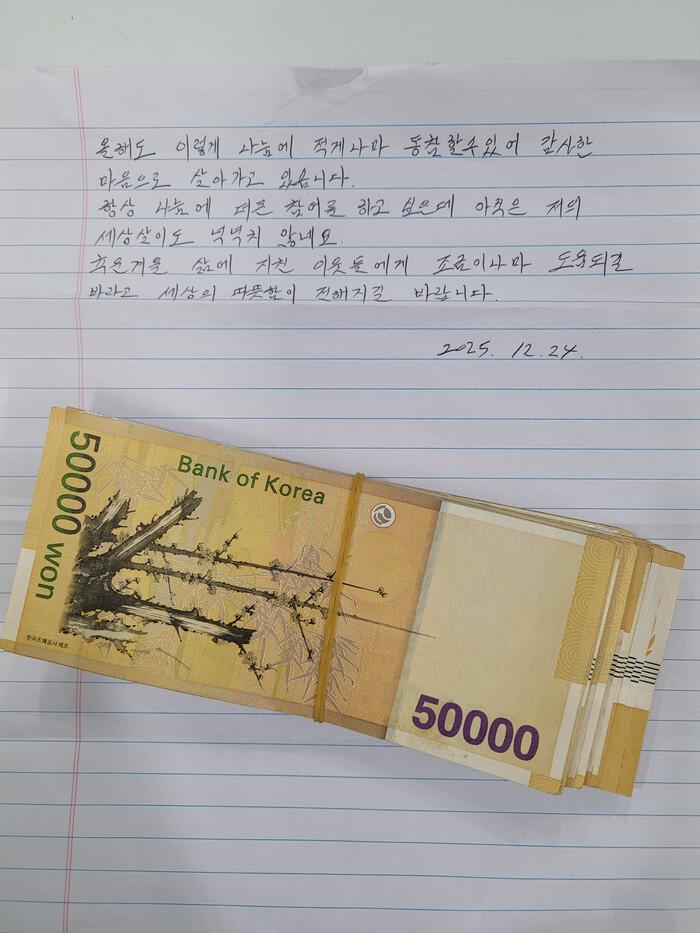이 기부자가 남긴 편지에는 “항상 나눔에 더 큰 참여를 하고 싶은데 아직은 저의 세상살이도 넉넉지 않네요. 추운 겨울 삶에 지친 이웃들에게 조금이나마 도움이 되길 바라고 세상의 따뜻함이 전해지길 바랍니다”라는 내용이 담겼다.