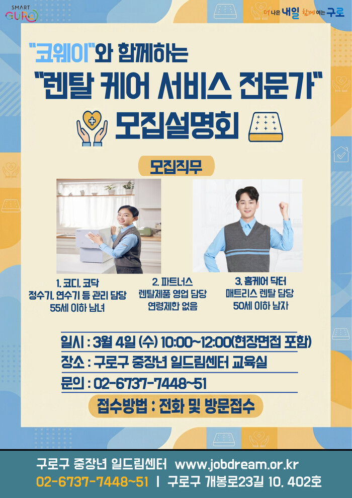행사는 관내 기업인 코웨이와 협력해 진행되며, 렌탈 케어 서비스 분야 20명을 모집한다. 채용 직무는 코디·코닥, 파트너스, 홈케어 닥터로 구성된다.