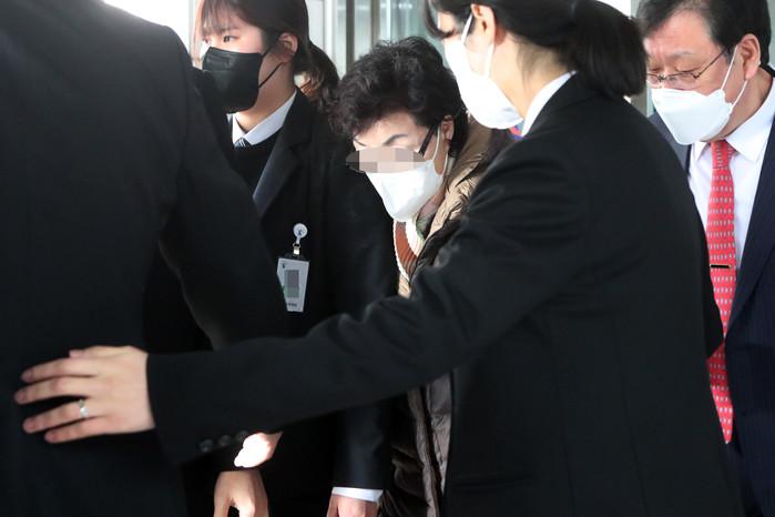 국민의힘 윤석열 대선후보의 장모 최 모씨가 23일 경기도 의정부시 가능동 의정부지방법원에서 선고 판결을 마친 뒤 부축을 받으며 차량으로 이동하고 있다. 땅 매입 과정에서 통장 잔고증명을 위조한 혐의 등으로 기소된 최씨는 이날 징역 1년을 선고받았다. (사진제공 = 연합뉴스)