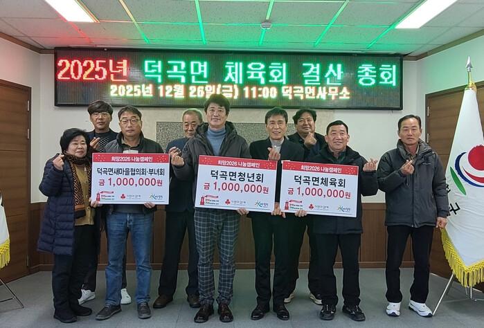 덕곡면 사회단체는 매년 이웃돕기 성금모금뿐만 아니라 체육대회, 경로잔치, 저소득가구 집수리, 떡국떡 나눔과 김장 나누기 등 다양한 봉사 활동을 통해 지역사회에 기여하고 있다.