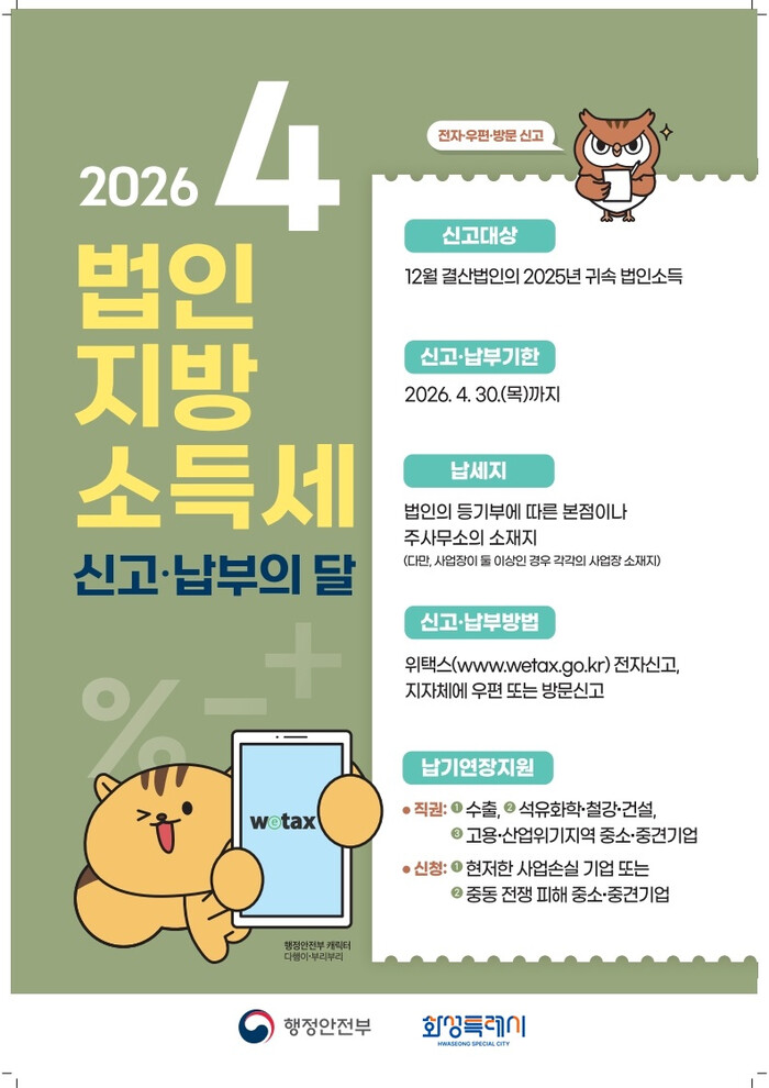 법인지방소득세는 법인이 해당 사업연도 소득을 기준으로 관할 시·군·구에 신고·납부하는 세금이다. 화성시 관내에 사업장을 둔 2025년 12월 결산 법인 중 법인세법에 따른 납세의무가 있는 법인은 오는 4월 30일까지 과세표준 및 세액을 신고하고 납부해야 한다.