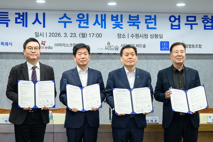 시와 (주)아이스크림에듀, (사)씨드(Seed)숲, 수원시서점협동조합은 지난 23일 시청 상황실에서 ‘수원새빛북런(Book Learn) 업무협약’을 체결하고, 협력을 약속했다.