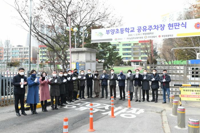 경기 구리시는 5일 부양초등학교 공유주차장 현판식을 개최했다. 시는 주차면 도색, CCTV 설치 등 부양초등학교 공유주차장(주차면 35면)을 지난해 12월 조성 완료하고, 올해부터 운영한다. 사진은 현판식에서 안승남 시장(가운데)과 관계자들이 기념촬영을 하는 모습. (사진제공=구리시청)
