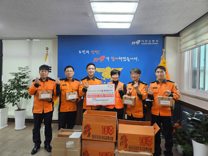경기 (재)이천시자원봉사센터가 최근 봉사자들이 직접 만든 대추청 70개와 생강청 70개 등 총 140개의 수제청을 이천소방서에 전달하며 소방관들에게 감사와 응원의 마음을 전했다. 사진은 전달식에서 이천소방서 관계자들이 기념 촬영을 하는 모습. (사진=이천시청 제공)