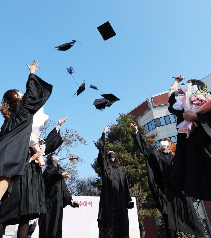 8일 오전 경기도 수원시 권선구 수원여자대학교에서 열린 학위수여식에서 졸업생들이 학사모를 높이 던지고 있다. (사진제공=연합뉴스)