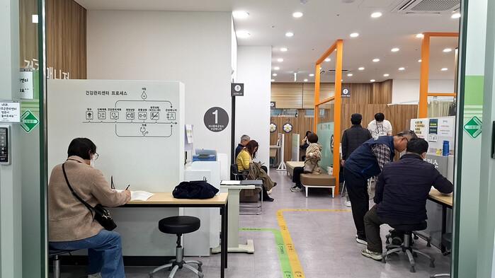 | ▲ 구로구보건소 건강관리센터를 방문한 주민들이 대사증후군 검진과 건강상담을 위해 대기하거나 설문지를 작성하고 있다. (사진=구로구청 제공) |