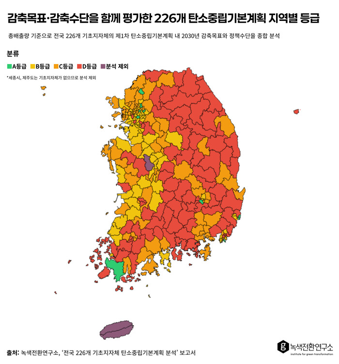 이번 분석은 지난해 기초지방자치단체가 수립한 탄소중립기본계획을 전수 분석한 결과로, 건물, 수송, 농축산, 폐기물, 흡수원 등 5개 영역을 대상으로 감축율을 정량평가하고, 지자체가 계획한 세부정책을 검토해 감축수단과 경로의 적정성을 정성평가해 종합 평가했다.