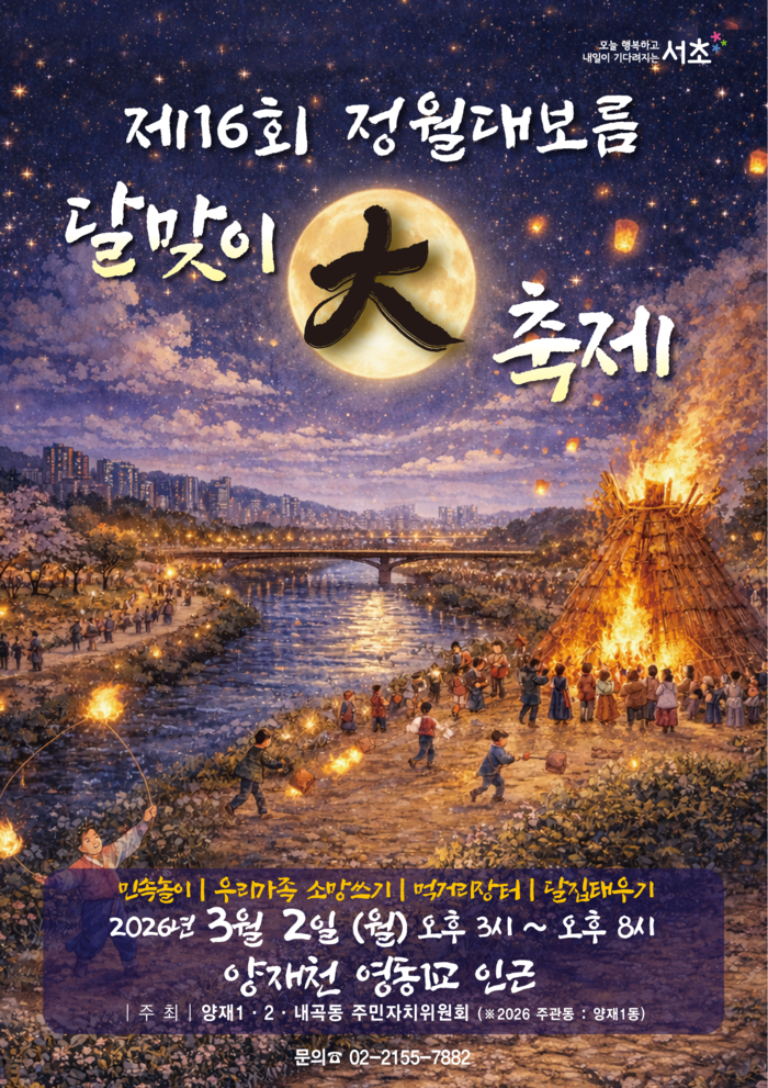 [시민일보 = 박소진 기자] 서초구(구청장 전성수)는 오는 3월 2일(월) 양재천 영동1교 하부에서 희망찬 새해 소망을 기원하는 ‘제16회 정월대보름 달맞이 대축제’를 개최한다고 밝혔다.