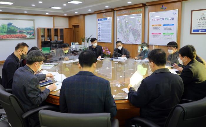 경기 수원시 권선구가 최근 각 부서장과 회의를 열고 권한대행체제 전환에 따른 추진방향과 부서별 현안업무를 논의했다. 사진은 이귀만 구청장(왼쪽 세 번째)이 회의를 주재하고 있는 모습. (사진제공=권선구청)