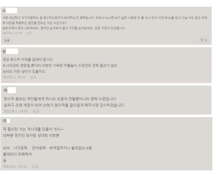 [시민일보 = 이대우 기자] 송파구(구청장 서강석)가 최근 실시한 ‘정당 현수막에 대한 구민 인식 조사’결과, 구민의 92.7%가 비방·안전 위협 정당 현수막은 즉시 철거해야 한다는 의견을 제시했다.