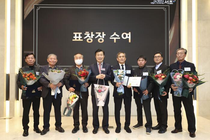 서울 서초구가 최근 엘타워 8층 '엘하우스홀'에서 '2025년 환경공무관 정년퇴임식'을 개최했다. 퇴임식은 공로 표창,퇴직자 및 가족 인사말, 기념 촬영 등으로 진행됐다. 사진은 퇴임식에서 전성수 구청장(왼쪽 네 번째)이 표창을 전달하고 관계자들과 기념 촬영을 하는 모습. (사진=서초구청 제공)
