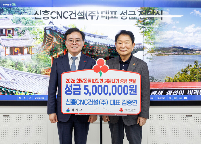 구는 지난 26일 김종연 신흥CNC건설 대표로부터 이웃돕기 성금 500만원을 전달받았다. 김 대표는 2019년도부터 따뜻한 나눔을 실천해 왔다. 현재까지 누적 성금은 6600만원으로, 강서구 기부자 명예의 전당에도 헌액된 바 있다.