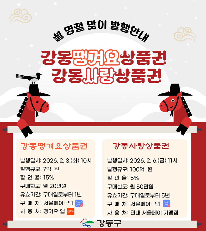 지역화폐 1차 발행은 먼저 설 명절을 앞두고 추진한다. 배달앱 땡겨요를 통해 음식 배달 주문 시 사용할 수 있는 강동땡겨요상품권은 7억원 규모로 발행(할인율 15%)되며, 오는 3일 오전 10시부터 구매할 수 있다.