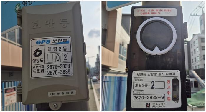 | ▲ 대림동 보안등 일반점멸기(좌-교체전), 양방향점멸기(우-교체후). (사진=영등포구청 제공) |