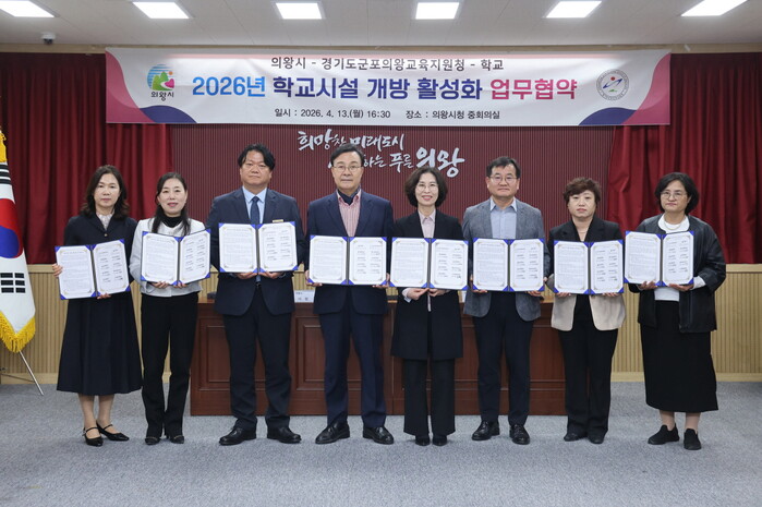 [의왕=송윤근 기자] 경기 의왕시가 지난 13일 시청 중회의실에서 군포의왕교육지원청 및 지역내 8개 학교와 ‘학교시설 개방 활성화 추가 업무협약’을 체결했다.