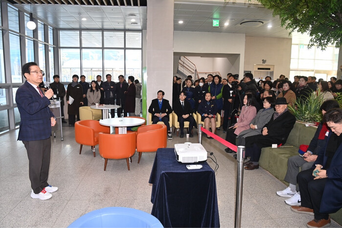 경기 하남시가 29일 종합복지타운에서 ‘하남교육지원청 신설추진단’ 현판식을 개최하고, 33만 시민의 숙원인 독립된 교육 행정 체계 구축을 위한 실질적인 실행 단계에 진입했다. 사진은 현판식에서 이현재 시장이 인사말을 하는 모습. (사진=하남시청 제공)