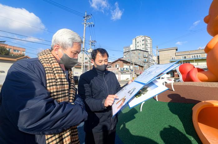 곽상욱 경기 오산시장은 13일 지역내 주요건설사업 현장인 ‘오산EBS캐릭터공원’과 ‘오산청년일자리카페 유잡스 운암점’ 추진상황을 점검했다. 사진은 이날 곽 시장(왼쪽)이 오는 3월 말 개장 예정인 오산EBS캐릭터공원 조성현장을 방문해 현장관계자와 대화를 하고 있는 모습. (사진제공=오산시청)