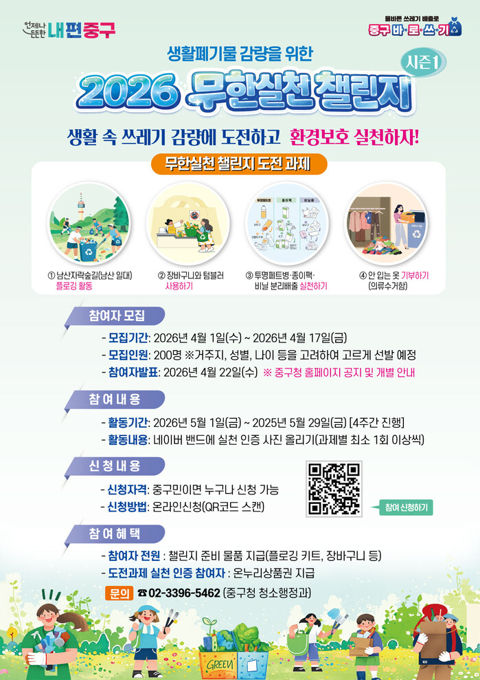 [시민일보 = 여영준 기자] 서울 중구는 생활폐기물 감량을 위한 ‘2026 무한실천 챌린지 시즌1’ 참여 주민 200명을 오는 17일까지 모집한다고 밝혔다.