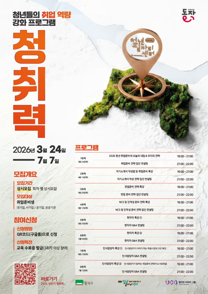 [시민일보 = 여영준 기자] 서울 동작구(구청장 박일하)는 본격적인 채용 시즌을 맞아 청년들의 성공적인 사회 진출을 돕기 위한 ‘청년취업역량강화(청취력)’프로그램을 운영한다고 밝혔다.