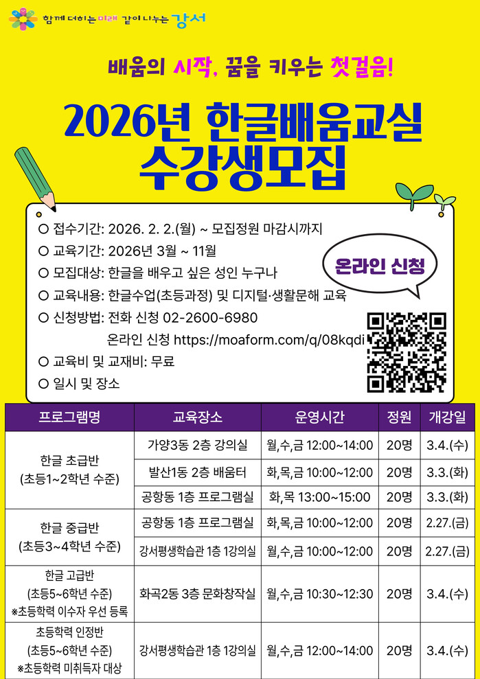 [시민일보 = 박소진 기자] 서울 강서구(구청장 진교훈)는 배움의 기회를 놓친 성인들의 문해 능력 향상을 돕기 위해 ‘한글배움교실’ 수강생을 모집한다고 2일 밝혔다.