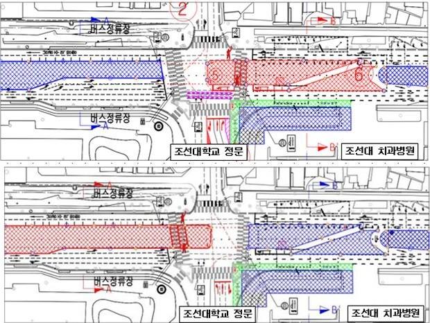 | ▲ 조선대 사거리 횡단공사 1단계 사업 위치도(상단)와 2단계 사업 위치도(하단) / 광주광역시 제공 |