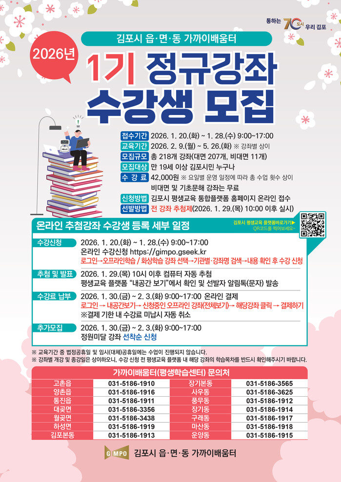 [김포=문찬식 기자] 경기 김포시가 시민의 평생학습 참여 기회를 확대와 지역 밀착형 학습 환경 조성을 위해 2026년 읍ㆍ면ㆍ동 가까이배움터 제1기 수강생을 모집한다고 밝혔다.