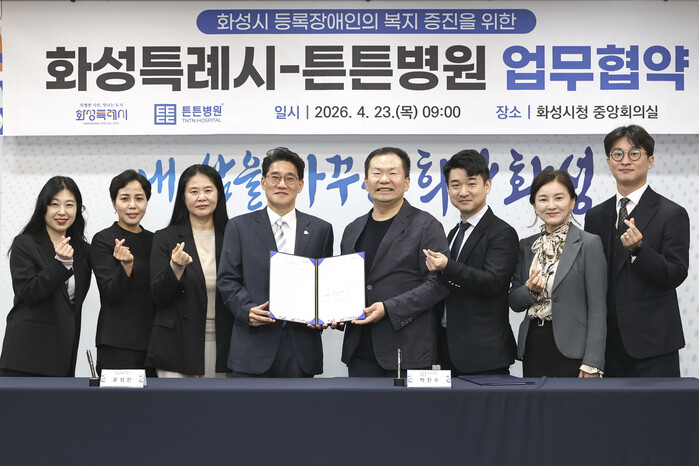 [화성=송윤근 기자] 경기 화성시는 23일 본관 2층 중앙회의실에서 튼튼병원과 화성시 등록장애인의 건강한 생활 지원과 삶의 질 향상을 위한 업무협약을 체결했다.