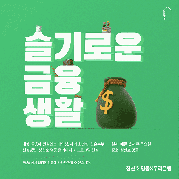 ‘슬기로운 금융생활’ 프로그램은 우리은행 금융 전문가가 직접 진행하며, 교육은 매달 초 ‘청신호 명동’ 홈페이지를 통해 사전 신청을 받는다.
