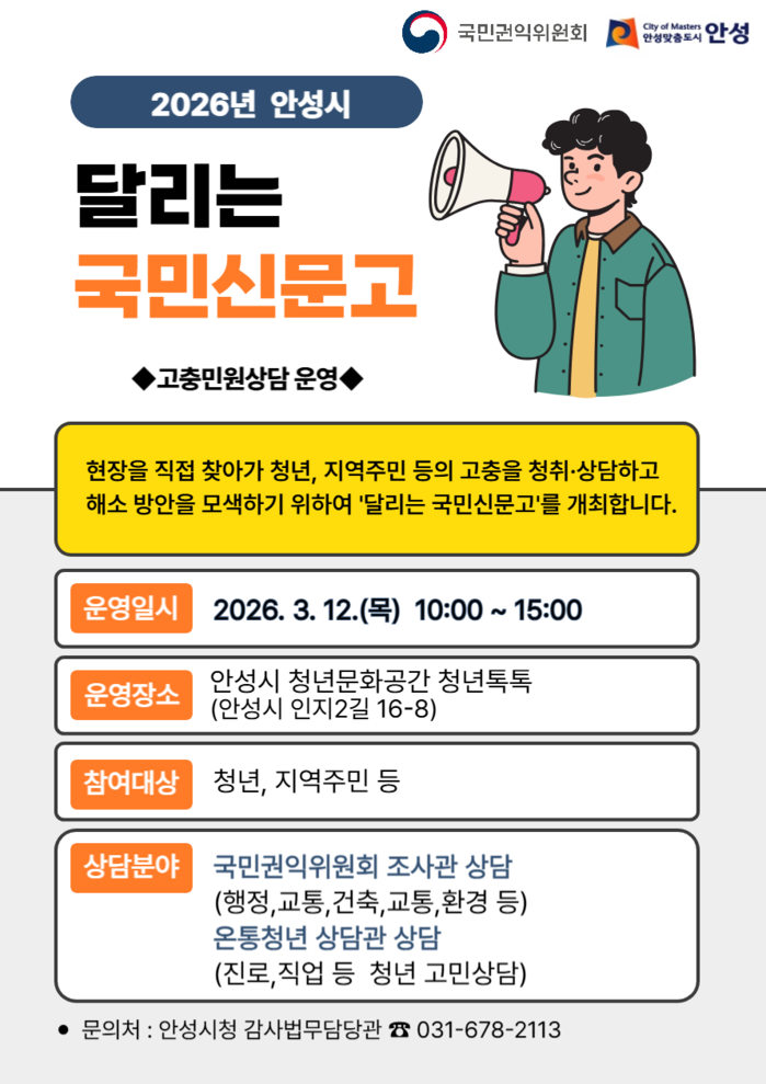 [안성=오왕석 기자] 안성시는 오는 12일 오전 10시부터 오후 3시까지 청년문화공간 ‘청년톡톡’(인지2길 16-8)에서 국민권익위원회와 함께 ‘달리는 국민신문고’를 운영한다.