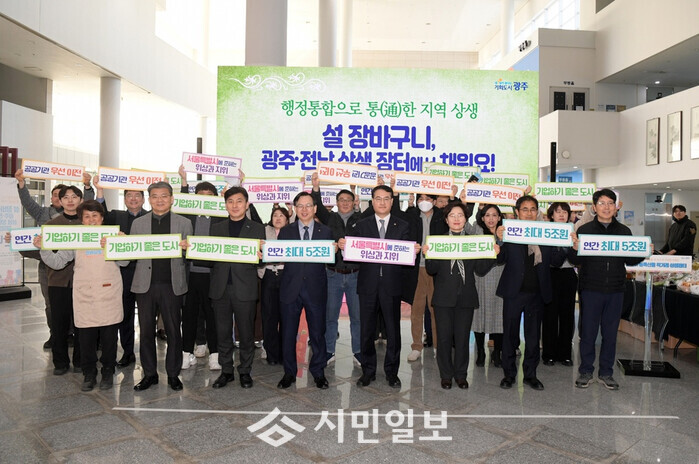 | ▲ 고광완 광주광역시 행정부시장, 김영문 문화경제부시장과 공직자 등이 9일 시청 1층 시민홀에서 설맞이 농특산물 직거래 장터 이용 캠페인 자료사진 / 광주광역시 제공 |