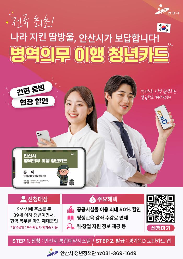 [안산=송윤근 기자] 경기 안산시가 2026년 1월부터 병역의무를 성실히 이행한 청년을 예우, 지원하기 위해 전국 최초로 ‘병역의무 이행 청년카드(이하 청년카드)’를 온라인으로 발급한다고 22일 밝혔다.