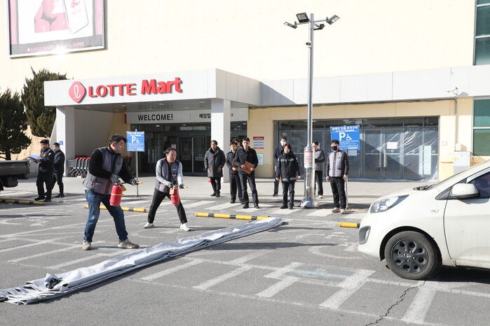 이날 현장에서는 전기차 화재 상황을 가정한 질식소화포 전개 시연도 진행됐다. 마트 자율소방대가 참여해 질식소화포를 전개하며 장비 숙련도를 점검하고, 관계인의 자기 주도적 소방시설 운영과 초기 대응 체계의 중요성을 공유했다.