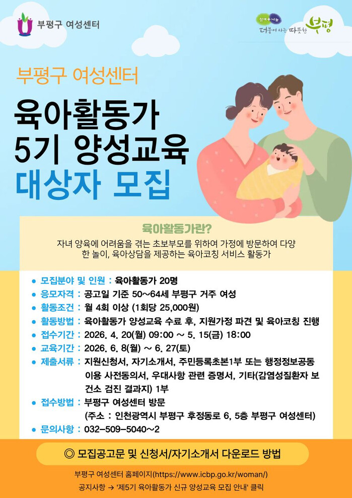 [인천=문찬식 기자] 인천 부평구는 오는 20일부터 5월15일까지 육아활동가 20명을 모집한다고 밝혔다.