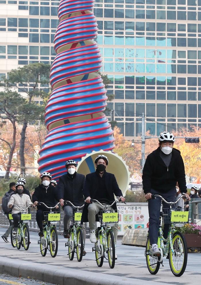 15일 오전 서울 중구 청계광장에서 열린 '포르쉐 드림 아트 따릉이' 공개 시승회에서 참석자들이 시승하고 있다. 서울문화재단 주최, 포르쉐코리아 후원 시민공모로 선정된 '아트 따릉이'는 총 356대로 16일부터 기존 따릉이 대여 방식으로 이용 가능하다.