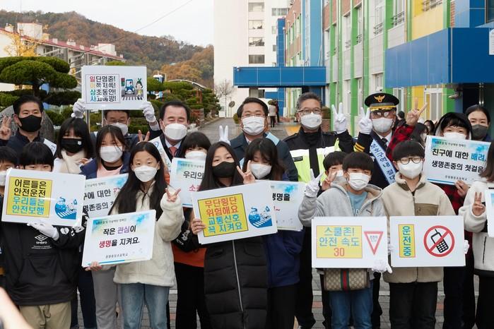 충남 아산시는 9일 온양중앙초등학교에서 유치원·초등학생 전면등교에 따른 어린이교통사고 예방 및 스쿨존 교통안전 확보를 위한 등굣길 합동캠페인과 학교주변 교통안전시설 점검 등을 유관기관과 함께 전개했다. 사진은 캠페인에 참석한 오세현 시장(뒷줄 가운데)과 관계자들이 기념촬영을 하는 모습. (사진제공=아산시청)
