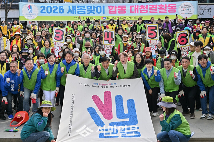 김이강 광주광역시 서구청장(오른 쪽부터 다섯 번쨰)이 14일 ‘세계 자원봉사자의 해’를 맞아 상무광장 일원에서 양부남 국회의원, (사)광주광역시서구자원봉사센터, 1365 자원봉사자 등과 ‘새봄맞이 합동 대청결 활동’ 시작에 앞서 기념촬영을 하고 있다./ 광주 서구 제공