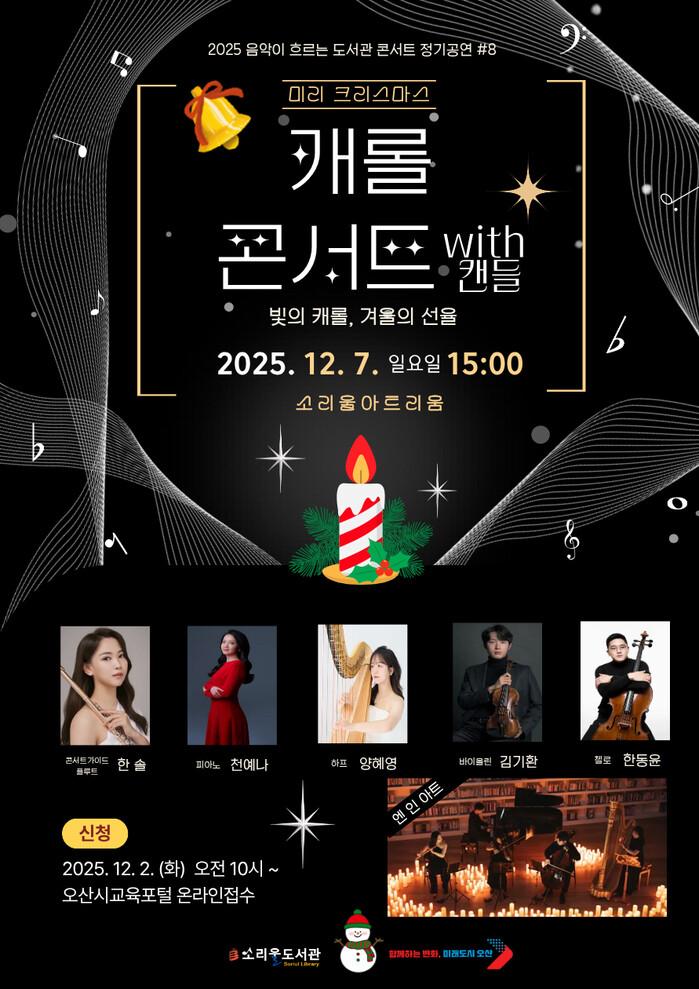 경기 오산시 소리울도서관은 연말을 맞아 시민들에게 겨울 감성을 선사하는 ‘미리 크리스마스-캐롤 콘서트 with 캔들’을 오는 12월 7일 오후 3시 소리울아트리움에서 개최한다고 밝혔다.