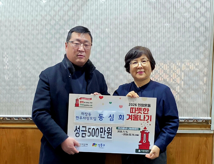 서울 성동구 마장동 주민센터가 최근 마장동을 대표하는 한우 축산물 업체 관계자들의 자발적 봉사 모임인 ‘동심회(마장동 한우사랑모임)’로부터 지역내 취약계층 지원을 위한 이웃돕기 성금 500만원을 전달받았다. 사진은 전달식에서 관계자들이 기념 촬영을 하는 모습. (사진=성동구청 제공)