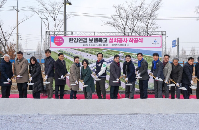 경기 하남시가 지난 11일 미사강변중학교와 미사한강공원 일대에서 ‘한강연결 보행육교’ 주민설명회 및 착공식을 개최했다. 이날 행사에는 사업시행자인 LH와 시공사인 서광건설산업(주)이 참여해 사업의 구체적인 청사진을 발표하고 주민들과 질의응답을 나누는 시간을 보냈다. 사진은 이현재 시장(가운데)을 비롯한 관계자들이 시삽을 하는 모습. (사진=하남시청 제공)