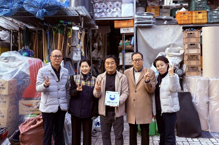 경기 수원시 권선구 세류2동 지역사회보장협의체가 26일, 정기적으로 나눔에 참여하는 '대흥철물상사'에 사랑나눔가게 현판을 전달했다. 사진은 전달식에 참석한 관계자들이 기념촬영을 하고 있는 모습. (사진=수원시청 제공)