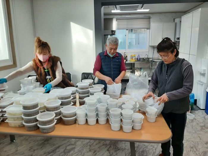 충남 예산군 응봉면 지역사회보장협의체는 13일 응봉면 노화리에 거주하는 김종호(복지식당)·이영숙씨의 재능기부를 통해 홀몸노인 40가구에 밑반찬 도시락을 전달했다. 사진은 봉사자들이 직접 만든 반찬을 포장하고 있는 모습. (사진제공=예산군청)
