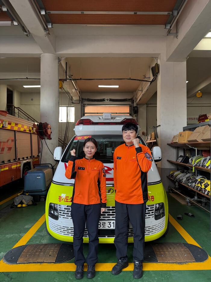 | ▲ 칭찬의 주인공은 정왕119안전센터 소속 소방장 노완기, 소방사 정이슬 구급대원 모습 /사진제공=시흥소방서 |