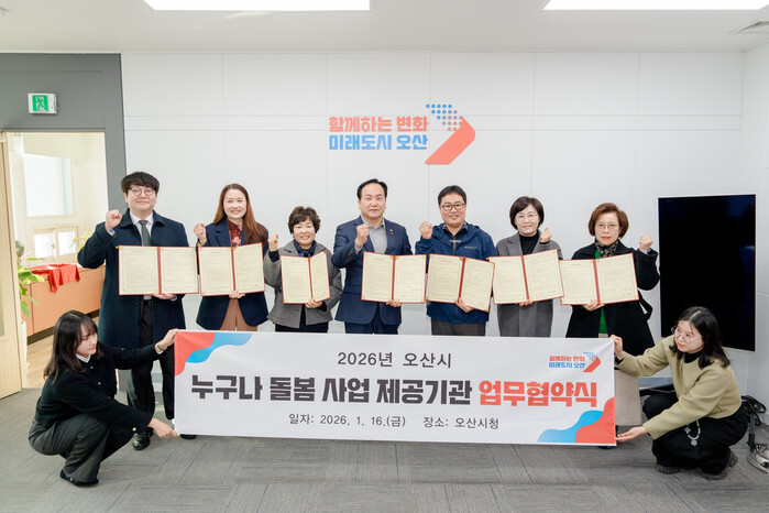 경기 오산시가 최근 돌봄 사각지대 해소를 위한 ‘누구나 돌봄사업’의 안정적인 추진을 위해 지역내 6개 서비스 제공기관과 업무협약을 체결했다. 사진은 이권재 시장(가운데)이 서비스 제공기관 관계자들과 기념 촬영을 하는 모습. (사진=오산시청 제공)
