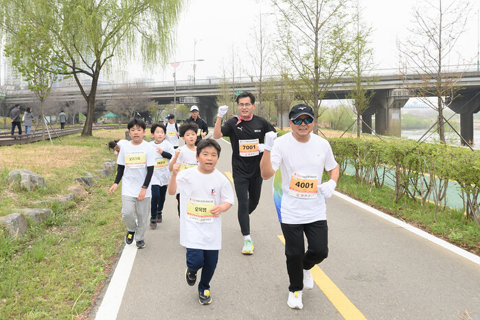 서울 양천구가 최근 안양천 일대에서 개최한 ‘제15회 양천마라톤 대회 #벚꽃런’을 성황리에 마무리했다. 이번 대회는 8400명의 참가자를 비롯해 자원봉사자와 진행요원 등 약 8700명이 참여하며 역대 최대 규모로 치러졌다. 사진은 벚꽃런에서 가족런 참가자들과 함께 달리고 있는 이기재 구청장(오른쪽 두 번째)과 이봉주 선수(오른쪽) 모습. (사진=양천구청 제공)