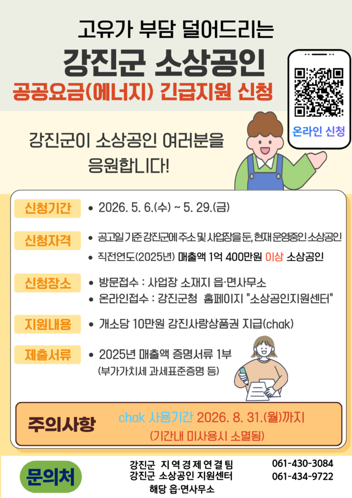 지원 대상은 공고일 기준 강진군 내에서 대표자 주민등록 주소 및 사업장을 운영 중인 소상공인으로, 직전 연도(2025년) 매출액이 1억400만원 이상인 업체다. 다만, 유흥주점 및 무도유흥주점 등 일부 업종은 지원 대상에서 제외된다.